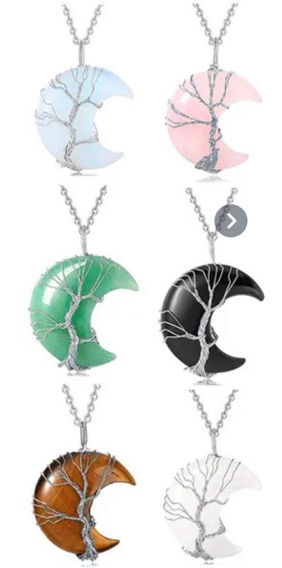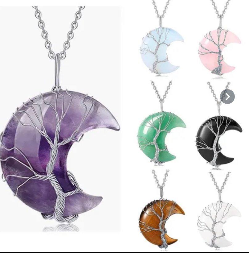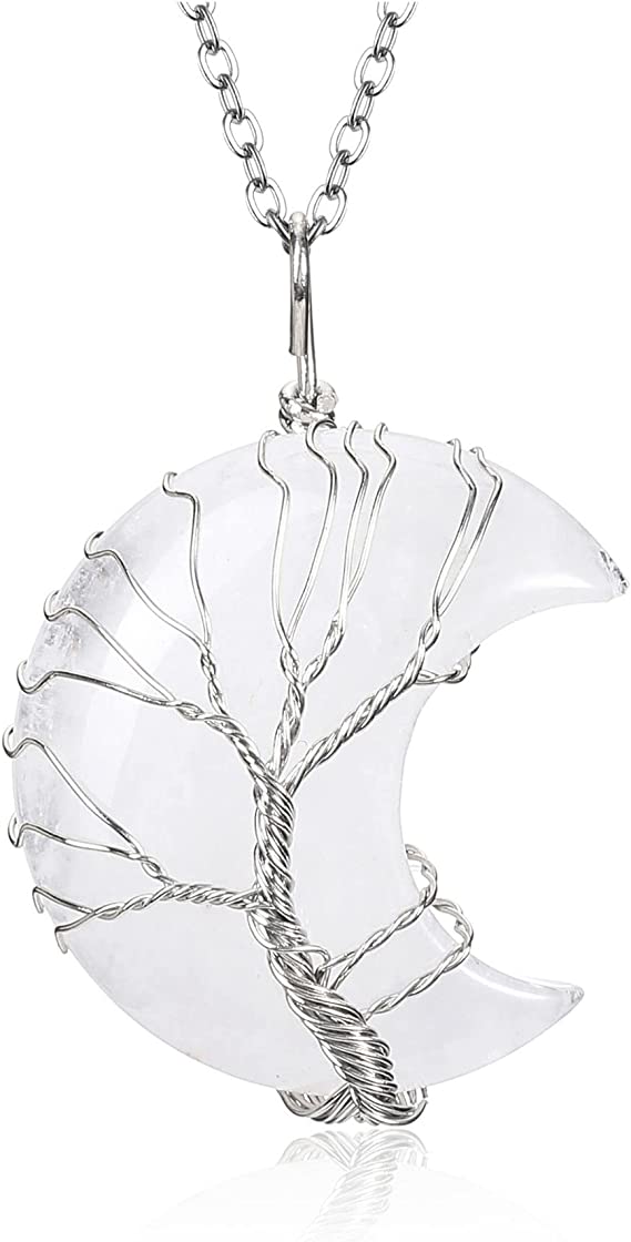 Collana con Ciondolo di Pietra Naturale Albero della Vita Curativa Cristallo con Pendente a forma di luna in filo d’argento Cristalloterapia