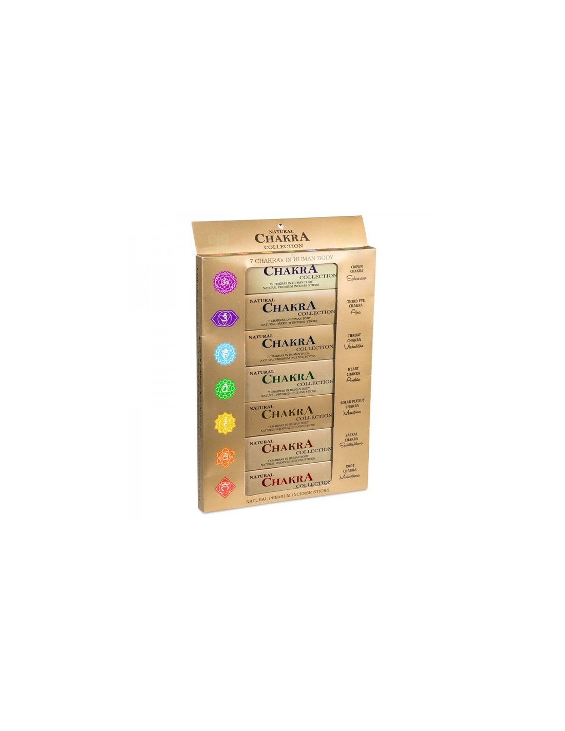 Confezione regalo color oro con 7 scatole di incenso indiano, una per ciascun chakra.