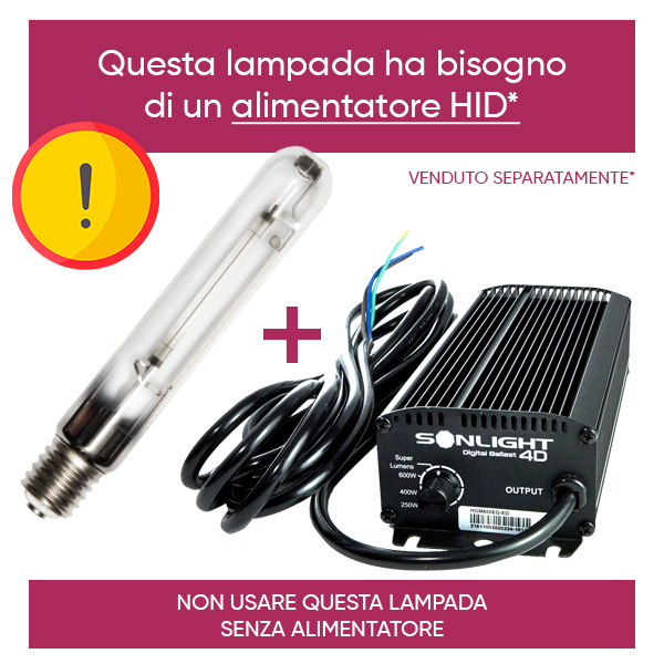 Questa tipologia di lampade richiede un alimentatore specifico per bulbi HID (hps e mh).