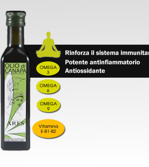 L’olio di canapa è una delle poche fonti alimentari di acido linolenico. È molto noto per l’ottimo equilibrio di acidi grassi essenziali omega 3 e omega 6 e per le importanti proprietà antiossidanti, immunomodulanti ed antinfiammatorie di cui è fornito.